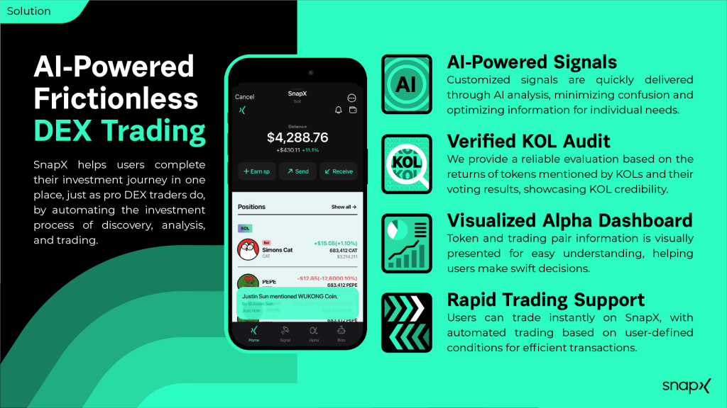 About company: SnapX helps users complete their investment journey in one place, just as pro DEX traders do, by automating the investment process of discovery, analysis, and trading.